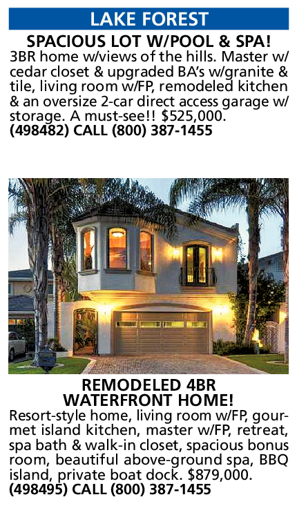 LAKE FOREST SPACIOUS LOT W/POOL & SPA! 3BR home w/views of the hills. Master w/ cedar closet & upgraded BA’s w/granite & tile, living room w/FP, remodeled kitchen & an oversize 2-car direct access garage w/ storage. A must-see!! $525,000. (498482) CALL (800) 387-1455 REMODELED 4BR WATERFRONT HOME! Resort-style home, living room w/FP, gourmet island kitchen, master w/FP, retreat, spa bath & walk-in closet, spacious bonus room, beautiful above-ground spa, BBQ island, private boat dock. $879,000. (498495) CALL (800) 387-1455