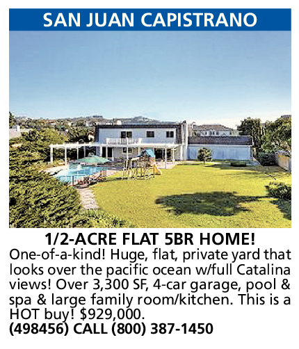 SAN JUAN CAPISTRANO 1/2-ACRE FLAT 5BR HOME! One-of-a-kind! Huge, flat, private yard that looks over the pacific ocean w/full Catalina views! Over 3,300 SF, 4-car garage, pool & spa & large family room/kitchen. This is a HOT buy! $929,000. (498456) CALL (800) 387-1450