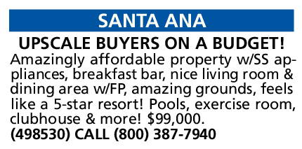 SANTA ANA UPSCALE BUYERS ON A BUDGET! Amazingly affordable property w/SS appliances, breakfast bar, nice living room & dining area w/FP, amazing grounds, feels like a 5-star resort! Pools, exercise room, clubhouse & more! $99,000. (498530) CALL (800) 387-7940