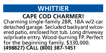 Charming single-family 2BR, 1BA w/2-car detached garage. Secluded backyard w/covered patio, enclosed hot tub. Long driveway w/private entry. Wood-burning FP. Perfect for the beginning family. $330,000. (498827) CALL (800) 387-1451