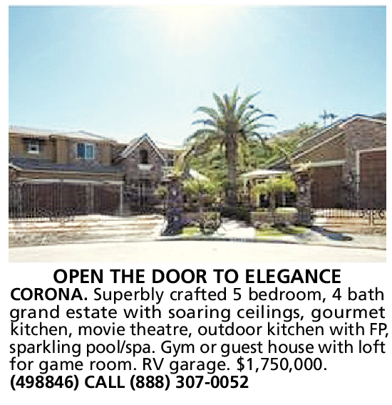 OPEN THE DOOR TO ELEGANCE CORONA. Superbly crafted 5 bedroom, 4 bath grand estate with soaring ceilings, gourmet kitchen, movie theatre, outdoor kitchen with FP, sparkling pool/spa. Gym or guest house with loft for game room. RV garage. $1,750,000.