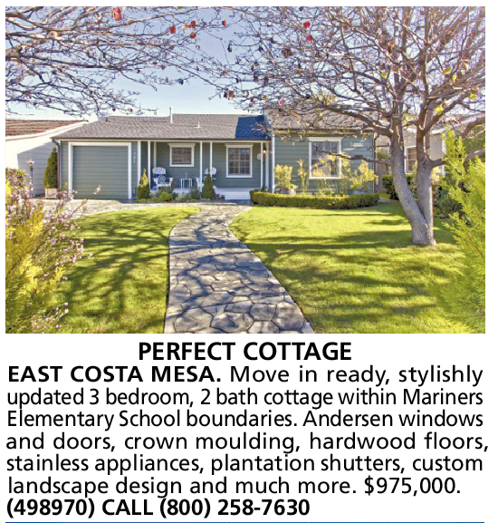 PERFECT COTTAGE EAST COSTA MESA. Move in ready, stylishly updated 3 bedroom, 2 bath cottage within Mariners Elementary School boundaries. Andersen windows and doors, crown moulding, hardwood floors, stainless appliances, plantation shutters, custom landscape design and much more. $975,000. (498970) CALL (800) 258-7630
