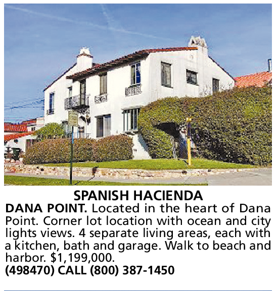 SPANISH HACIENDA DANA POINT. Located in the heart of Dana Point. Corner lot location with ocean and city lights views. 4 separate living areas, each with a kitchen, bath and garage. Walk to beach and harbor. $1,199,000. (498470) CALL (800) 387-1450