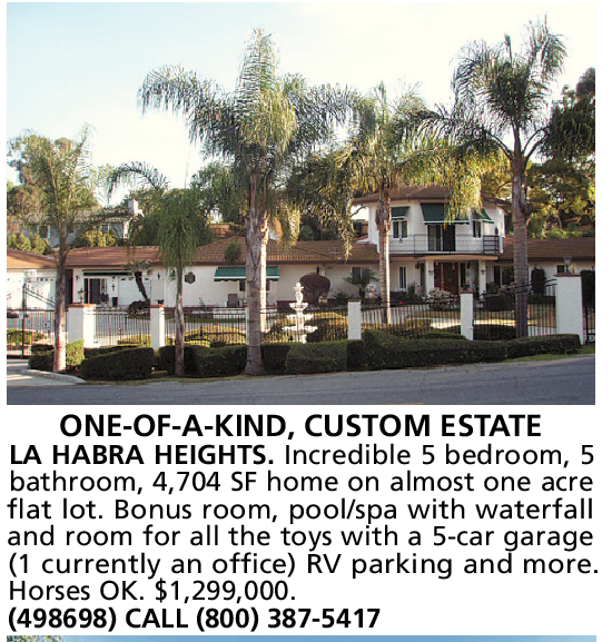 ONE-OF-A-KIND, CUSTOM ESTATE LA HABRA HEIGHTS. Incredible 5 bedroom, 5 bathroom, 4,704 SF home on almost one acre flat lot. Bonus room, pool/spa with waterfall and room for all the toys with a 5-car garage (1 currently an office) RV parking and more. Horses OK. $1,299,000. (498698) CALL (800) 387-5417