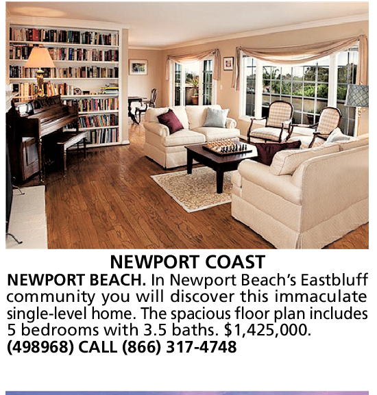 NEWPORT COAST NEWPORT BEACH. In Newport Beach’s Eastbluff community you will discover this immaculate single-level home. The spacious floor plan includes 5 bedrooms with 3.5 baths. $1,425,000. (498968) CALL (866) 317-4748