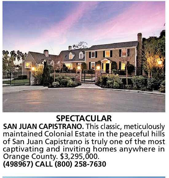 SPECTACULAR SAN JUAN CAPISTRANO. This classic, meticulously maintained Colonial Estate in the peaceful hills of San Juan Capistrano is truly one of the most captivating and inviting homes anywhere in Orange County. $3,295,000. (498967) CALL (800) 258-7630