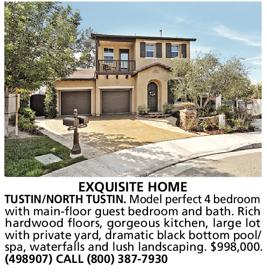EXQUISITE HOME TUSTIN/NORTH TUSTIN. Model perfect 4 bedroom with main-floor guest bedroom and bath. Rich hardwood floors, gorgeous kitchen, large lot with private yard, dramatic black bottom pool/ spa, waterfalls and lush landscaping. $998,000. (498907) CALL (800) 387-7930