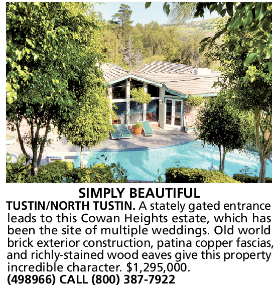 SIMPLY BEAUTIFUL TUSTIN/NORTH TUSTIN. A stately gated entrance leads to this Cowan Heights estate, which has been the site of multiple weddings. Old world brick exterior construction, patina copper fascias, and richly-stained wood eaves give this property incredible character. $1,295,000. (498966) CALL (800) 387-7922