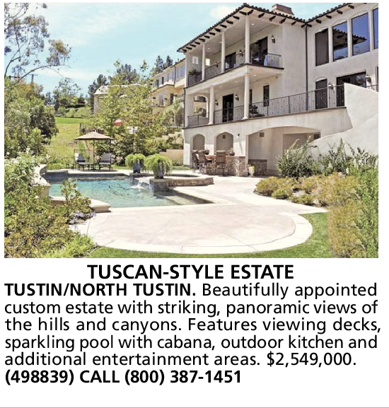 TUSCAN-STYLE ESTATE TUSTIN/NORTH TUSTIN. Beautifully appointed custom estate with striking, panoramic views of the hills and canyons. Features viewing decks, sparkling pool with cabana, outdoor kitchen and additional entertainment areas. $2,549,000. (498839) CALL (800) 387-1451