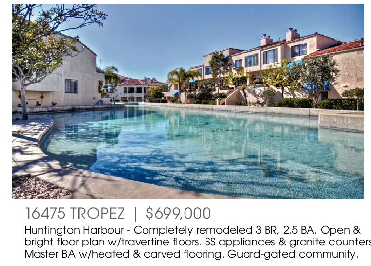 16475 TROPEZ | $699,000 Huntington Harbour - Completely remodeled 3 BR, 2.5 BA. Open & bright floor plan w/travertine floors. SS appliances & granite counters. Master BA w/heated & carved flooring. Guard-gated community.