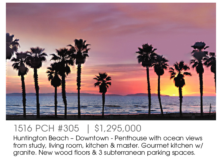 1516 PCH #305 | $1,295,000 Huntington Beach – Downtown - Penthouse with ocean views from study, living room, kitchen & master. Gourmet kitchen w/ granite. New wood floors & 3 subterranean parking spaces.