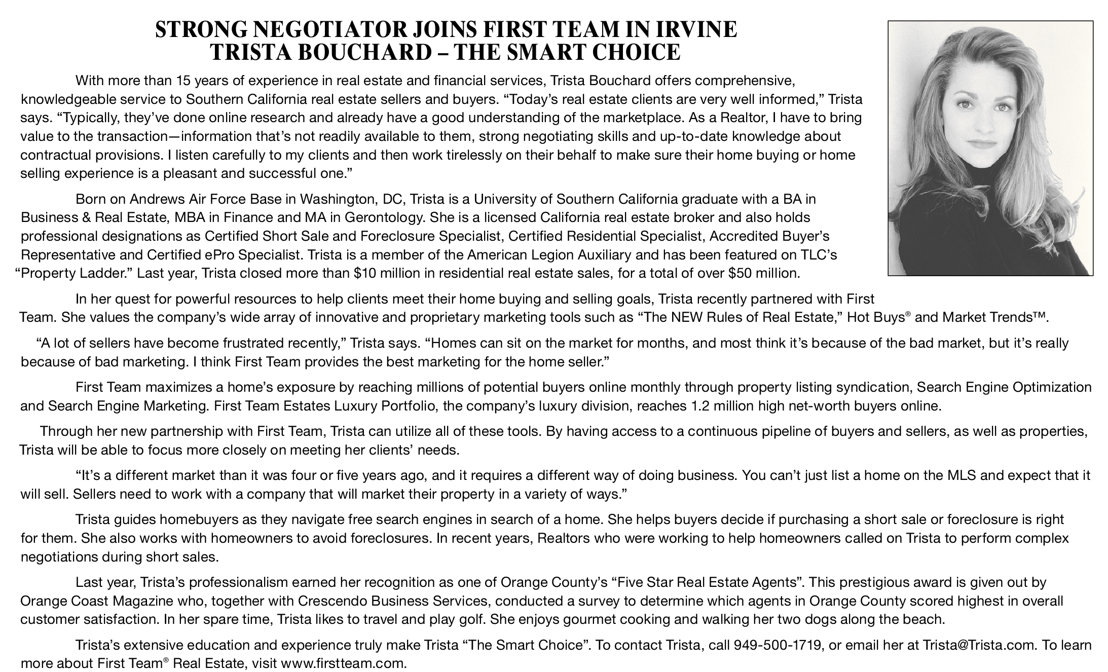 STRONG NEGOTIATOR JOINS FIRST TEAM IN IRVINE TRISTA BOUCHARD – THE SMART CHOICE