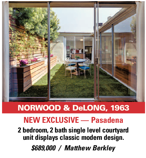 NORWOOD & DeLONG, 1963 NEW EXCLUSIVE — Pasadena 2 bedroom, 2 bath single level courtyard unit displays classic modern design.