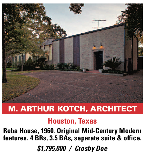 M. ARTHUR KOTCH, ARCHITECT Houston, Texas Reba House, 1960. Original Mid-Century Modern features. 4 BRs, 3.5 BAs, separate suite & office.