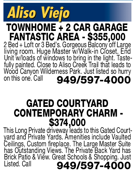 Aliso Viejo TOWNHOME + 2 CAR GARAGE FANTASTIC AREA - $355,000 2 Bed + Loft or 3 Bed’s. Gorgeous Balcony off Large living room. Huge Master w/Walk-in Closet. End Unit w/loads of windows to bring in the light. Tastefully painted. Close to Aliso Creek Trail that leads to Wood Canyon Wilderness Park. Just listed so hurry on this one. Call 949/597-4000 GATED COURTYARD CONTEMPORARY CHARM - $374,000 This Long Private driveway leads to this Gated Courtyard and Private Yards. Amenities include Vaulted Ceilings, Custom fireplace. The Large Master Suite has Outstanding Views. The Private Back Yard has Brick Patio & View. Great Schools & Shopping. Just Listed. Call 949/597-4000