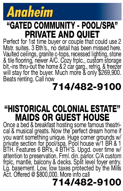 “HISTORICAL COLONIAL ESTATE” MAIDS OR GUEST HOUSE Once a bed & breakfast hosting some famous theatrical & musical greats. Now the perfect dream home if you want something unique. Huge corner grounds w/ private section for pool/spa. Pool house w/1 BR & 1 BTH. Features 6 BR’s, 4 BTH’S. Upgd. over time w/ attention to preservation. Frml. din. parlor. C/A custom frplc, mantle, balcony & decks. Split level foyer entry. Lg. basement. Low, low taxes protected by the Mills Act. Offered @ $800,000. More info call 714/482-9100