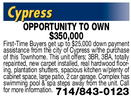 OPPORTUNITY TO OWN $350,000 First-Time Buyers get up to $25,000 down payment assistance from the city of Cypress w/the purchase of this Townhome. This unit offers; 3BR, 3BA, totally repainted, new carpet installed, real hardwood flooring, plantation shutters, spacious kitchen w/plenty of cabinet space, large patio, 2 car garage. Complex has swimming pool & spa steps away from the unit. Call for more information. 714/843-0123