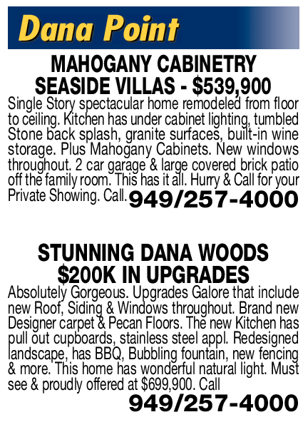 MAHOGANY CABINETRY SEASIDE VILLAS - $539,900 Single Story spectacular home remodeled from floor to ceiling. Kitchen has under cabinet lighting, tumbled Stone back splash, granite surfaces, built-in wine storage. Plus Mahogany Cabinets. New windows throughout. 2 car garage & large covered brick patio off the family room. This has it all. Hurry & Call for your Private Showing. Call. 949/257-4000