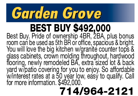 Garden Grove BEST BUY $492,000 Best Buy. Pride of ownership 4BR, 2BA, plus bonus room can be used as 5th BR or office, spacious & bright. You will love the big kitchen w/granite counter tops & glass cabinets, crown molding throughout, hardwood flooring, newly remodeled BA, extra sized lot & back yard w/patio covering for you to enjoy. So affordable w/interest rates at a 50 year low, easy to qualify. Call for more information. $492,000. 714/964-2121 See also