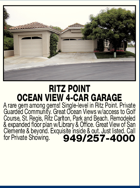 RITZ POINT OCEAN VIEW 4-CAR GARAGE A rare gem among gems! Single-level in Ritz Point. Private Guarded Community. Great Ocean Views w/access to Golf Course, St. Regis, Ritz Carlton, Park and Beach. Remodeled & expanded floor plan w/Library & Office. Great View of San Clemente & beyond. Exquisite inside & out. Just listed. Call for Private Showing. 949/257-4000