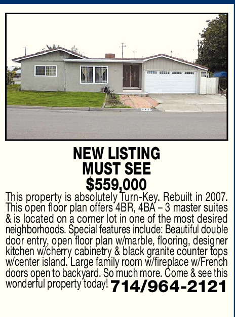 NEW LISTING MUST SEE $559,000 This property is absolutely Turn-Key. Rebuilt in 2007. This open floor plan offers 4BR, 4BA – 3 master suites & is located on a corner lot in one of the most desired neighborhoods. Special features include: Beautiful double door entry, open floor plan w/marble, flooring, designer kitchen w/cherry cabinetry & black granite counter tops w/center island. Large family room w/fireplace w/French doors open to backyard. So much more. Come & see this wonderful property today! 714/964-2121