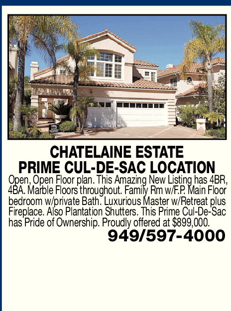 CHATELAINE ESTATE PRIME CUL-DE-SAC LOCATION Open, Open Floor plan. This Amazing New Listing has 4BR, 4BA. Marble Floors throughout. Family Rm w/F.P. Main Floor bedroom w/private Bath. Luxurious Master w/Retreat plus Fireplace. Also Plantation Shutters. This Prime Cul-De-Sac has Pride of Ownership. Proudly offered at $899,000. 949/597-4000