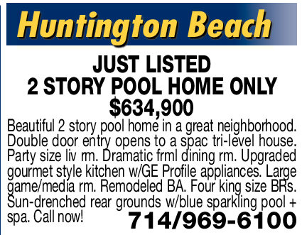 JUST LISTED 2 STORY POOL HOME ONLY $634,900 Beautiful 2 story pool home in a great neighborhood. Double door entry opens to a spac tri-level house. Party size liv rm. Dramatic frml dining rm. Upgraded gourmet style kitchen w/GE Profile appliances. Large game/media rm. Remodeled BA. Four king size BRs. Sun-drenched rear grounds w/blue sparkling pool + spa. Call now! 714/969-6100