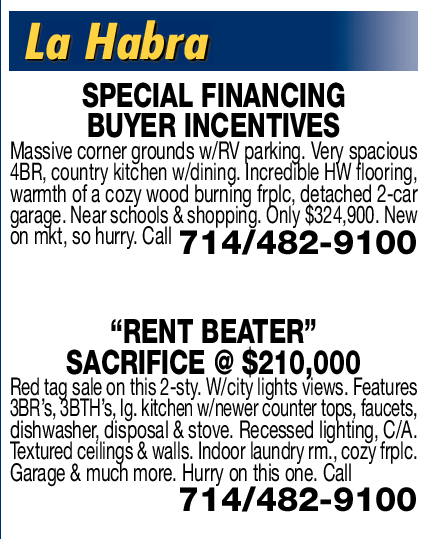 “RENT BEATER” SACRIFICE @ $210,000 Red tag sale on this 2-sty. W/city lights views. Features 3BR’s, 3BTH’s, lg. kitchen w/newer counter tops, faucets, dishwasher, disposal & stove. Recessed lighting, C/A. Textured ceilings & walls. Indoor laundry rm., cozy frplc. Garage & much more. Hurry on this one. Call 714/482-9100