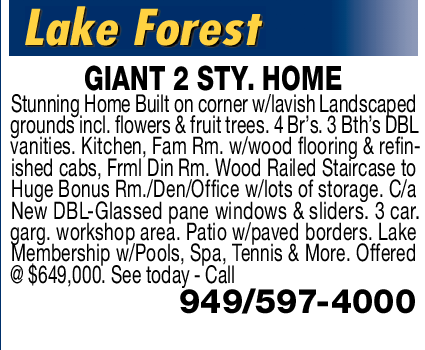 Lake Forest GIANT 2 STY. HOME Stunning Home Built on corner w/lavish Landscaped grounds incl. flowers & fruit trees. 4 Br’s. 3 Bth’s DBL vanities. Kitchen, Fam Rm. w/wood flooring & refinished cabs, Frml Din Rm. Wood Railed Staircase to Huge Bonus Rm./Den/Office w/lots of storage. C/a New DBL-Glassed pane windows & sliders. 3 car. garg. workshop area. Patio w/paved borders. Lake Membership w/Pools, Spa, Tennis & More. Offered @ $649,000. See today - Call 949/597-4000