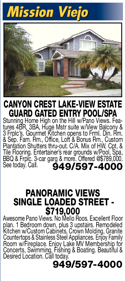 Mission Viejo CANYON CREST LAKE-VIEW ESTATE GUARD GATED ENTRY POOL/SPA Stunning Home High on the Hill w/Pano Views. Features 4BR, 3BA, Huge Mstr suite w/View Balcony & 3 Frplc’s. Gourmet Kitchen opens to Frml. Din. Rm. & Sep. Fam. Rm., Office, Loft & Bonus Rm., Custom Plantation Shutters thru-out. C/A. Mix of HW, Cpt, & Tile Flooring. Entertainer’s rear grounds w/Pool, Spa, BBQ & Frplc. 3-car garg & more. Offered @$789,000. See today. Call. 949/597-4000 PANORAMIC VIEWS SINGLE LOADED STREET - $719,000 Awesome Pano Views. No Mello Roos. Excellent Floor plan. 1 Bedroom down, plus 3 upstairs. Remodeled Kitchen w/Custom Cabinets, Crown Molding, Granite Countertops & Stainless Steel Appliances. Enjoy Family Room w/Fireplace. Enjoy Lake MV Membership for Concerts, Swimming, Fishing & Boating. Beautiful & Desired Location. Call today. 949/597-4000