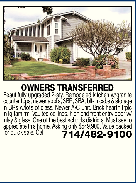 OWNERS TRANSFERRED Beautifully upgraded 2-sty. Remodeled kitchen w/granite counter tops, newer appl’s, 3BR, 3BA, blt-in cabs & storage in BRs w/lots of class. Newer A/C unit. Brick hearth frplc in lg fam rm. Vaulted ceilings, high end front entry door w/ inlay & glass. One of the best schools districts. Must see to appreciate this home. Asking only $549,900. Value packed for quick sale. Call 714/482-9100