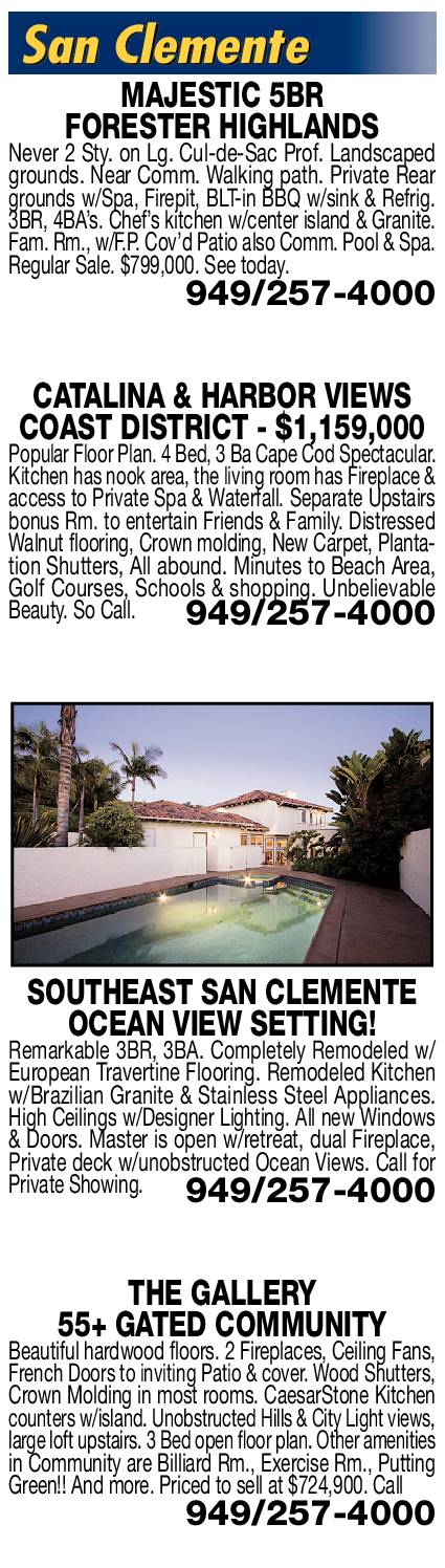 CATALINA & HARBOR VIEWS COAST DISTRICT - $1,159,000 Popular Floor Plan. 4 Bed, 3 Ba Cape Cod Spectacular. Kitchen has nook area, the living room has Fireplace & access to Private Spa & Waterfall. Separate Upstairs bonus Rm. to entertain Friends & Family. Distressed Walnut flooring, Crown molding, New Carpet, Plantation Shutters, All abound. Minutes to Beach Area, Golf Courses, Schools & shopping. Unbelievable Beauty. So Call. 949/257-4000