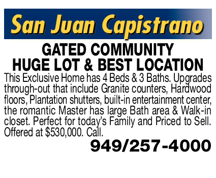 San Juan Capistrano GATED COMMUNITY HUGE LOT & BEST LOCATION This Exclusive Home has 4 Beds & 3 Baths. Upgrades through-out that include Granite counters, Hardwood floors, Plantation shutters, built-in entertainment center, the romantic Master has large Bath area & Walk-in closet. Perfect for today’s Family and Priced to Sell. Offered at $530,000. Call. 949/257-4000