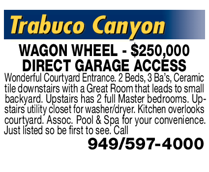 WAGON WHEEL - $250,000 DIRECT GARAGE ACCESS Wonderful Courtyard Entrance. 2 Beds, 3 Ba’s, Ceramic tile downstairs with a Great Room that leads to small backyard. Upstairs has 2 full Master bedrooms. Upstairs utility closet for washer/dryer. Kitchen overlooks courtyard. Assoc. Pool & Spa for your convenience. Just listed so be first to see. Call 949/597-4000