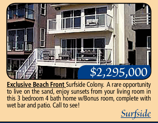 Exclusive Beach Front Surfside Colony. A rare opportunity to live on the sand, enjoy sunsets from your living room in this 3 bedroom 4 bath home w/Bonus room, complete with wet bar and patio. Call to see!