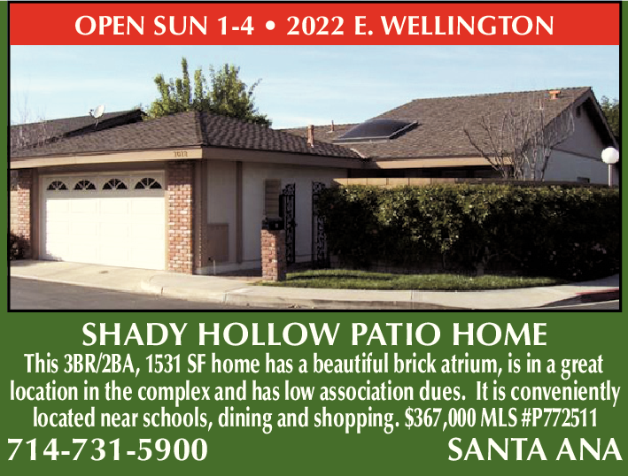 SHADY HOLLOW PATIO HOME This 3BR/2BA, 1531 SF home has a beautiful brick atrium, is in a great location in the complex and has low association dues. It is conveniently located near schools, dining and shopping. $367,000 MLS #P772511 714-731-5900 SANTA ANA