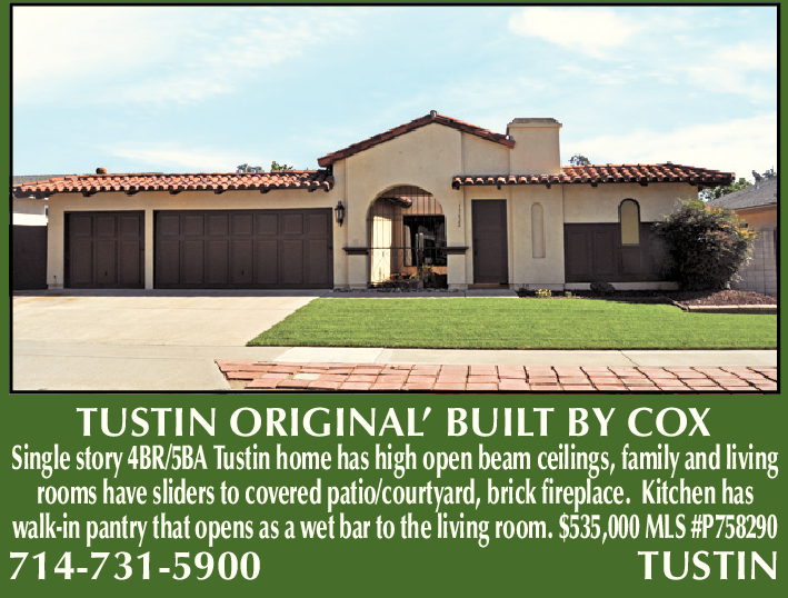 TUSTIN ORIGINAL’ BUILT BY COX Single story 4BR/5BA Tustin home has high open beam ceilings, family and living rooms have sliders to covered patio/courtyard, brick fireplace. Kitchen has walk-in pantry that opens as a wet bar to the living room. $535,000 MLS #P758290 714-731-5900 TUSTIN