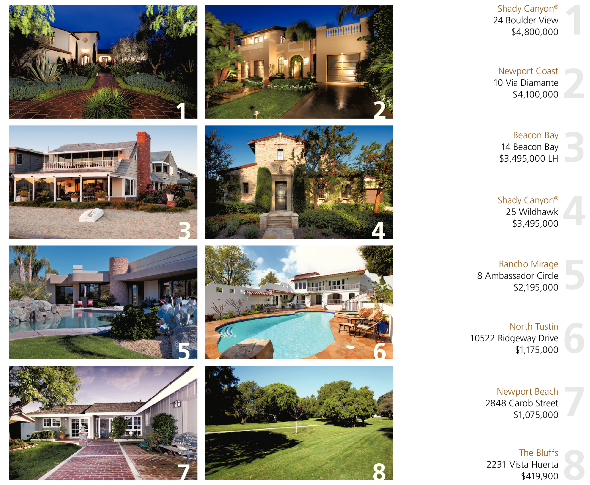 1 3 5 7 2 4 6 8 Shady Canyon ® 24 Boulder View $4,800,000 Newport Coast 10 Via Diamante $4,100,000 Beacon Bay 14 Beacon Bay $3,495,000 LH Shady Canyon ® 25 Wildhawk $3,495,000 Rancho Mirage 8 Ambassador Circle $2,195,000 North Tustin 10522 Ridgeway Drive $1,175,000 Newport Beach 2848 Carob Street $1,075,000 The Bluffs 2231 Vista Huerta $419,900 1 2 3 4 5 6 7 8