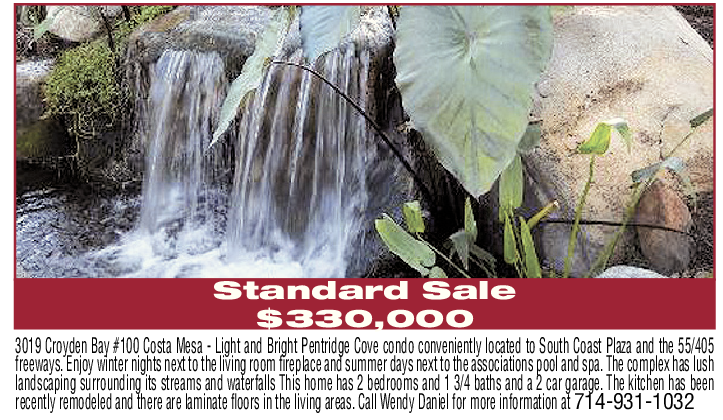 Standard Sale $330,000 3019 Croyden Bay #100 Costa Mesa - Light and Bright Pentridge Cove condo conveniently located to South Coast Plaza and the 55/405 freeways. Enjoy winter nights next to the living room fireplace and summer days next to the associations pool and spa. The complex has lush landscaping surrounding its streams and waterfalls This home has 2 bedrooms and 1 3/4 baths and a 2 car garage. The kitchen has been recently remodeled and there are laminate floors in the living areas. Call Wendy Daniel for more information at 714-931-1032