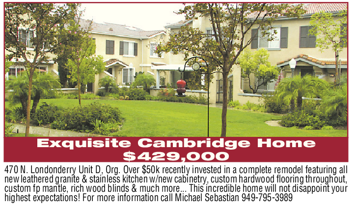 Exquisite Cambridge Home $429,000 470 N. Londonderry Unit D, Org. Over $50k recently invested in a complete remodel featuring all new leathered granite & stainless kitchen w/new cabinetry, custom hardwood flooring throughout, custom fp mantle, rich wood blinds & much more... This incredible home will not disappoint your highest expectations! For more information call Michael Sebastian 949-795-3989