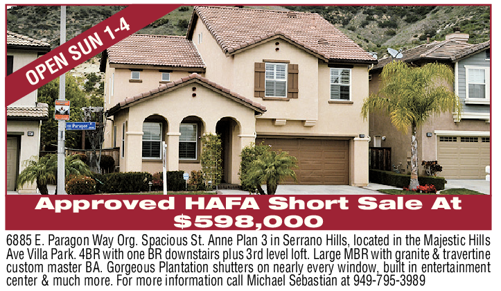 Approved HAFA Short Sale At $598,000 6885 E. Paragon Way Org. Spacious St. Anne Plan 3 in Serrano Hills, located in the Majestic Hills Ave Villa Park. 4BR with one BR downstairs plus 3rd level loft. Large MBR with granite & travertine custom master BA. Gorgeous Plantation shutters on nearly every window, built in entertainment center & much more. For more information call Michael Sebastian at 949-795-3989