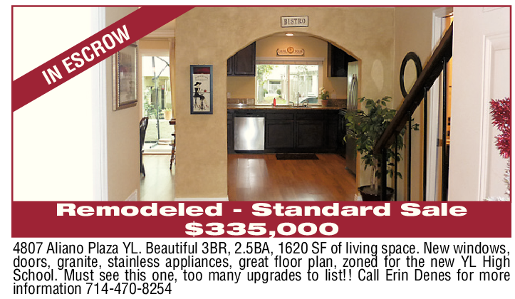 Remodeled - Standard Sale $335,000 4807 Aliano Plaza YL. Beautiful 3BR, 2.5BA, 1620 SF of living space. New windows, doors, granite, stainless appliances, great floor plan, zoned for the new YL High School. Must see this one, too many upgrades to list!! Call Erin Denes for more information 714-470-8254