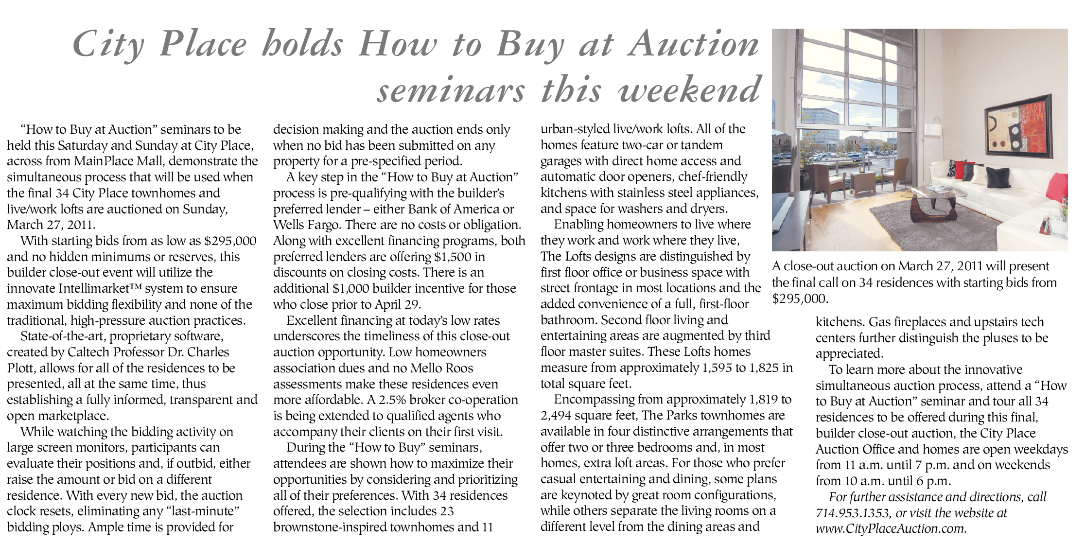 “How to Buy at Auction” seminars to be held this Saturday and Sunday at City Place, across from MainPlace Mall, demonstrate the simultaneous process that will be used when the final 34 City Place townhomes and live/work lofts are auctioned on Sunday, March 27, 2011.