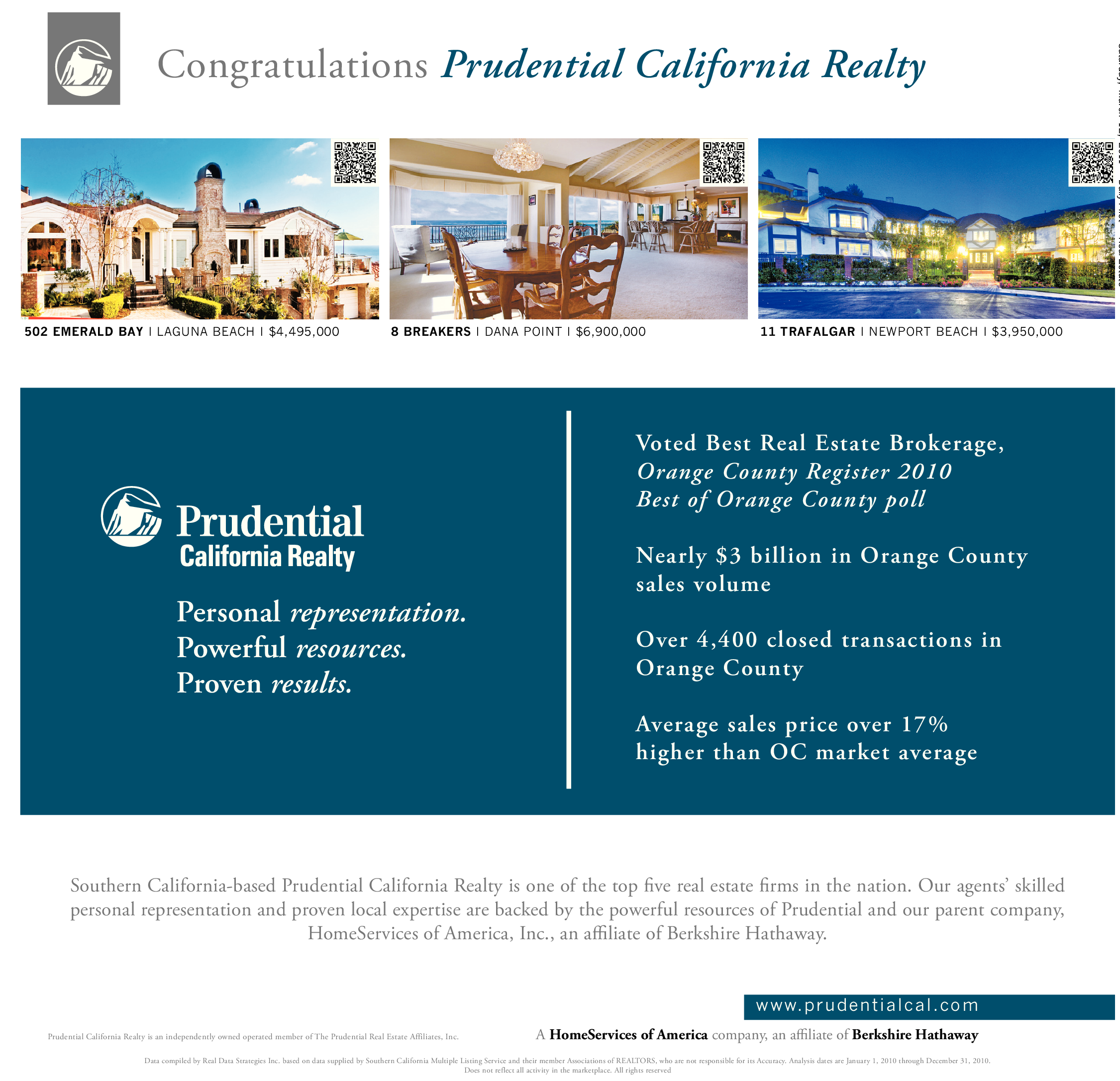 Southern California-based Prudential California Realty is one of the top five real estate firms in the nation. Our agents’ skilled personal representation and proven local expertise are backed by the powerful resources of Prudential and our parent company, HomeServices of America, Inc., an affiliate of Berkshire Hathaway.