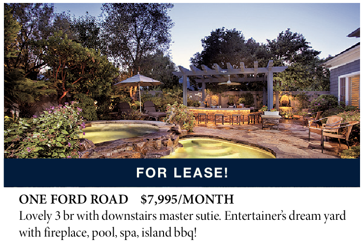 ONE FORD ROAD $7,995/MONTH Lovely 3 br with downstairs master sutie. Entertainer’s dream yard with fireplace, pool, spa, island bbq!