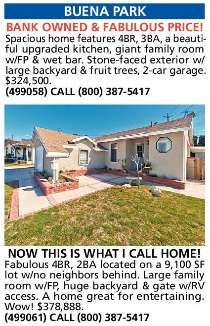 BUENA PARK BANK OWNED & FABULOUS PRICE! Spacious home features 4BR, 3BA, a beautiful upgraded kitchen, giant family room w/FP & wet bar. Stone-faced exterior w/ large backyard & fruit trees, 2-car garage. $324,500. (499058) CALL (800) 387-5417