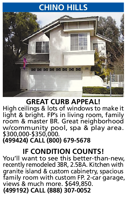 CHINO HILLS GREAT CURB APPEAL! High ceilings & lots of windows to make it light & bright. FP’s in living room, family room & master BR. Great neighborhood w/community pool, spa & play area. $300,000-$350,000. (499424) CALL (800) 679-5678 IF CONDITION COUNTS! You’ll want to see this better-than-new, recently remodeled 3BR, 2.5BA. Kitchen with granite island & custom cabinetry, spacious family room with custom FP. 2-car garage, views & much more. $649,850. (499192) CALL (888) 307-0052