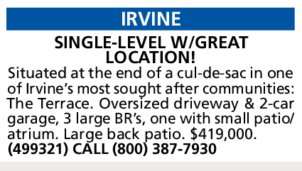 IRVINE SINGLE-LEVEL W/GREAT LOCATION! Situated at the end of a cul-de-sac in one of Irvine’s most sought after communities: The Terrace. Oversized driveway & 2-car garage, 3 large BR’s, one with small patio/ atrium. Large back patio. $419,000. (499321) CALL (800) 387-7930