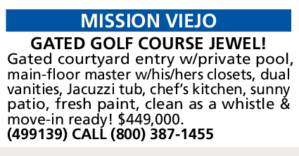 Gated courtyard entry w/private pool, main-floor master w/his/hers closets, dual vanities, Jacuzzi tub, chef’s kitchen, sunny patio, fresh paint, clean as a whistle & move-in ready! $449,000. (499139) CALL (800) 387-1455