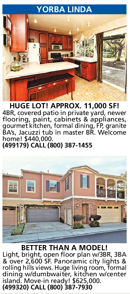 YORBA LINDA HUGE LOT! APPROX. 11,000 SF! 4BR, covered patio in private yard, newer flooring, paint, cabinets & appliances, gourmet kitchen, formal dining, FP, granite BA’s, Jacuzzi tub in master BR. Welcome home! $440,000. (499179) CALL (800) 387-1455 BETTER THAN A MODEL! Light, bright, open floor plan w/3BR, 3BA & over 2,600 SF. Panoramic city lights & rolling hills views. Huge living room, formal dining w/dumbwaiter, kitchen w/center island. Move-in ready! $625,000. (499320) CALL (800) 387-7930
